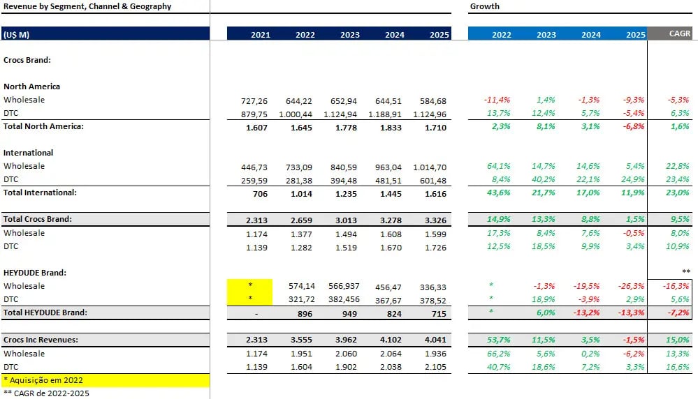 Na tabela acima, temos uma quebra das suas receitas por segmento (Crocs e Hey Dude), canal (DTC e atacado) e geografia (América do Norte ou internacional). Nela, vemos que o crescimento da companhia como um todo tem sido fruto do crescimento da marca Crocs, especialmente nos mercados internacionais. Contudo, a Hey Dude teve seu auge em 2023 e, desde então, suas receitas vêm caindo.