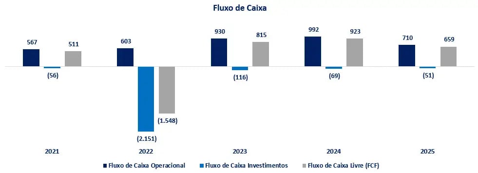 Apesar dos riscos, a Crocs continua sendo uma empresa que gera um bom caixa. Com exceção de 2022 — quando fez a aquisição da HeyDude —, o fluxo de caixa livre da companhia esteve ao longo dos últimos cinco anos em patamares acima de US$ 500 milhões. Em 2025 (um ano ruim para o varejo em geral), a Crocs teve uma geração de caixa livre de US$ 660 milhões.
