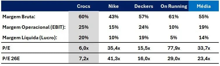 Fazendo uma comparação com outras empresas de calçados, vemos que a Crocs possui uma margem bruta em linha com marcas “premium”, como a On Running. Mas, ao mesmo tempo, a margem líquida fica alinhada com marcas mais consolidadas, como a Deckers. E hoje ela negocia a uma fração do preço dessas companhias.