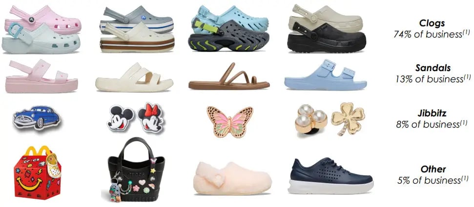 No caso da Crocs, a empresa fabrica e vende calçados casuais, principalmente os famosos clogs feitos com Croslite, uma resina leve e confortável que se tornou a assinatura da marca.