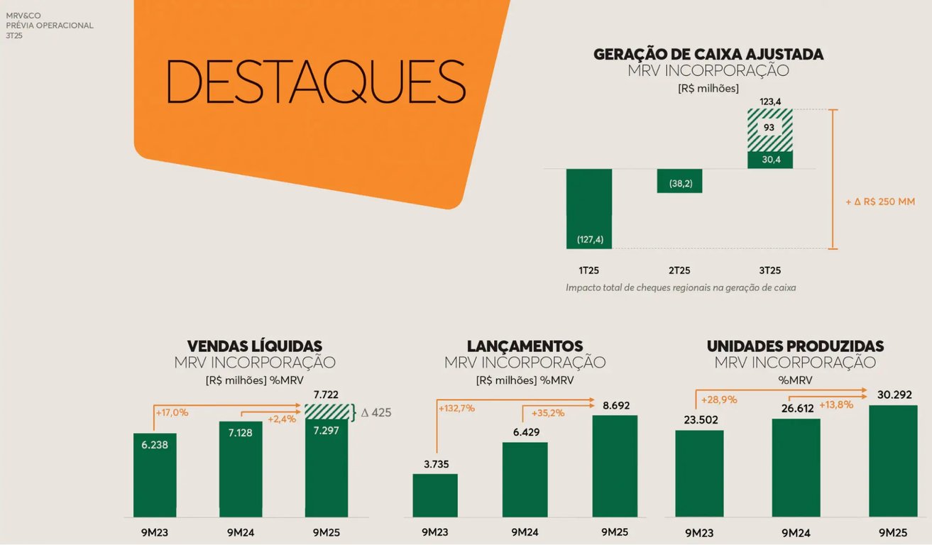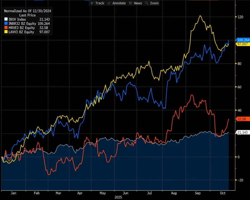 Em 2025, as ações do Inter (INBR32) lideram os ganhos com valorização de +100,26%, seguidas por Lavvi (LAVV3), que sobe +97,01%, e MRV (MRVE3), com alta de +32,58%. No mesmo período, o Ibovespa acumula avanço mais modesto de +21,14%.