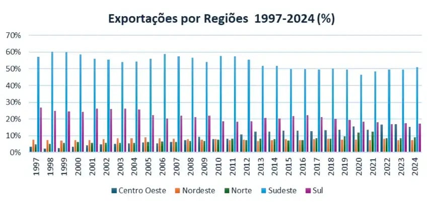 Dentro do Brasil, a região Sudeste é de longe a que mais exporta, seguida de Sul e Centro-Oeste.