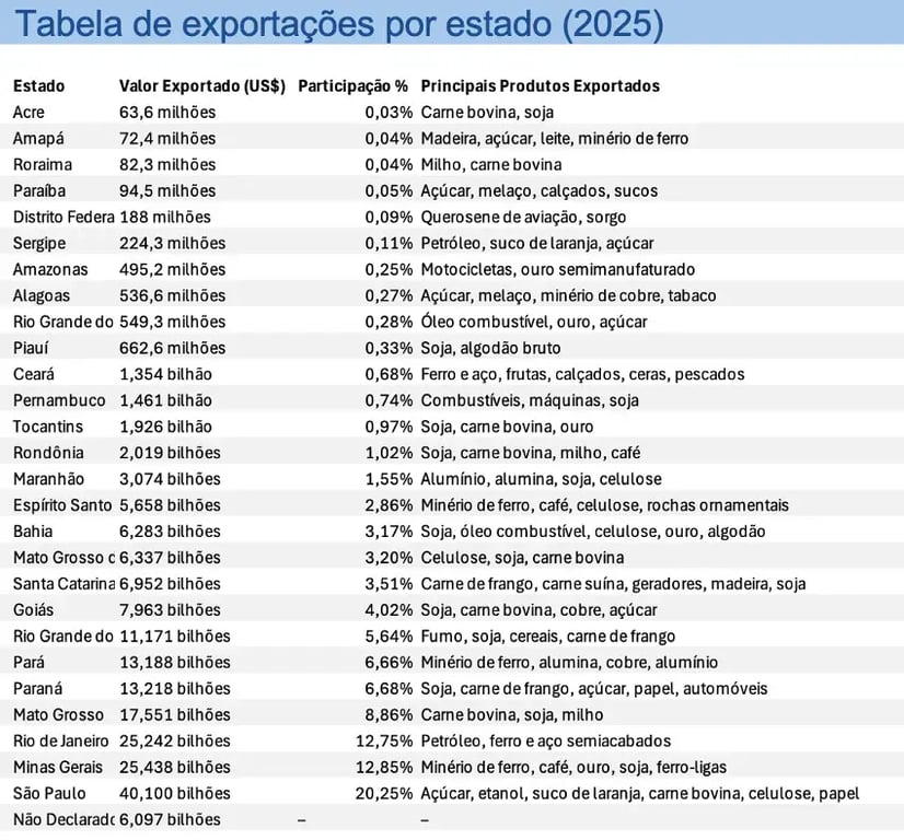Carne bovina, soja, trigo, açúcar e etanol aparecem como os principais vetores de exportação. Os produtos mais exportados em 2025 foram: