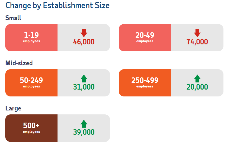 O resultado ruim foi motivado especialmente pela perda de empregos em pequenas empresas (companhias com 1 a 49 funcionários), enquanto as de médio e grande porte registraram ganhos.