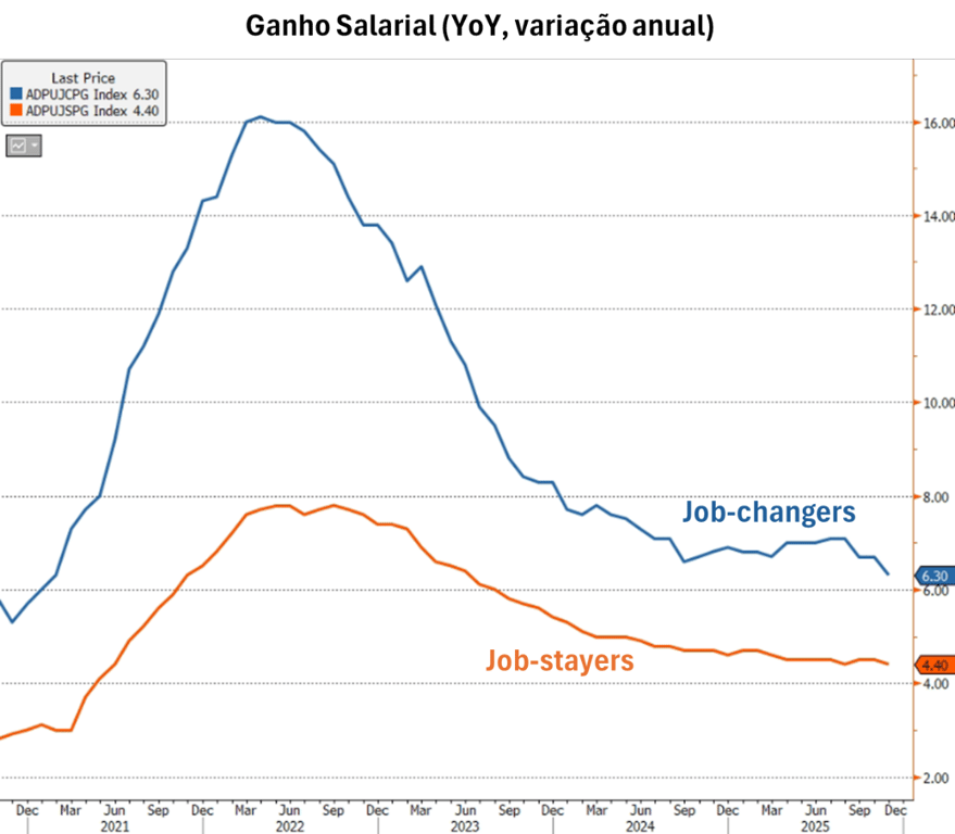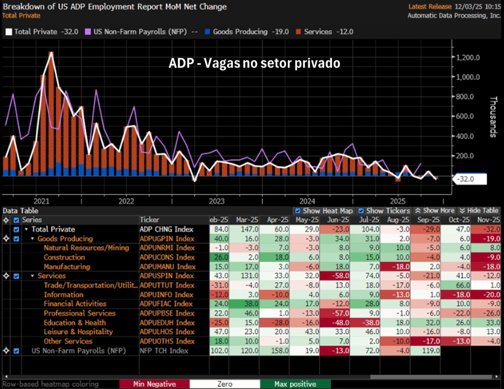Dessa forma, se o ADP apresenta um resultado mais fraco, o mercado passa a enxergar menores pressões inflacionárias vindas pelo lado da atividade. Ou seja, um dado mais fraco aumenta o otimismo do mercado sobre as quedas de juros.
