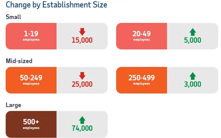 O resultado positivo foi motivado especialmente pelas grandes empresas (large, com +74 mil vagas), contrastando com os fracos resultados nas pequenas e médias empresas.