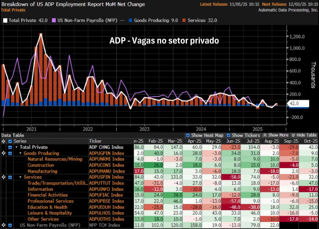Dessa forma, se o ADP apresenta um resultado mais fraco, o mercado passa a enxergar menores pressões inflacionárias vindas pelo lado da atividade. Ou seja, um dado mais fraco aumenta o otimismo do mercado sobre as quedas de juros.