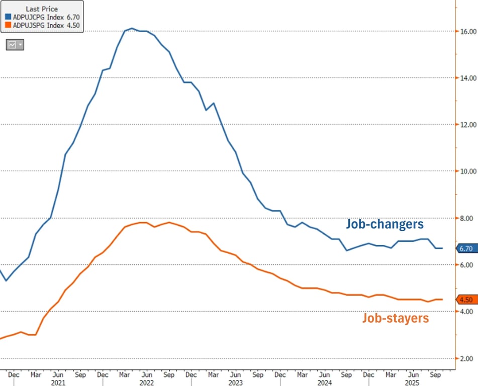 O ganho salarial dos Job-Changers, ou seja, daqueles que mudaram de emprego nos últimos 12 meses, permaneceu em 6,7%, o menor patamar desde setembro de 2024 (6,6%).
