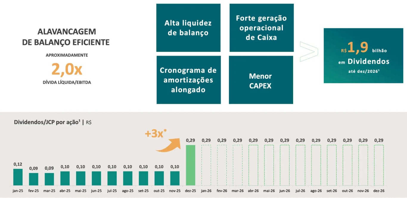 Com a baixa necessidade de novos investimentos e uma meta de alavancagem de 2x, a companhia anunciou que praticamente triplicaria os valores distribuídos mensalmente, de R$ 0,10 para cerca de R$ 0,29 (caso não aumentasse, sua alavancagem cairia para 1,3x em 2026).