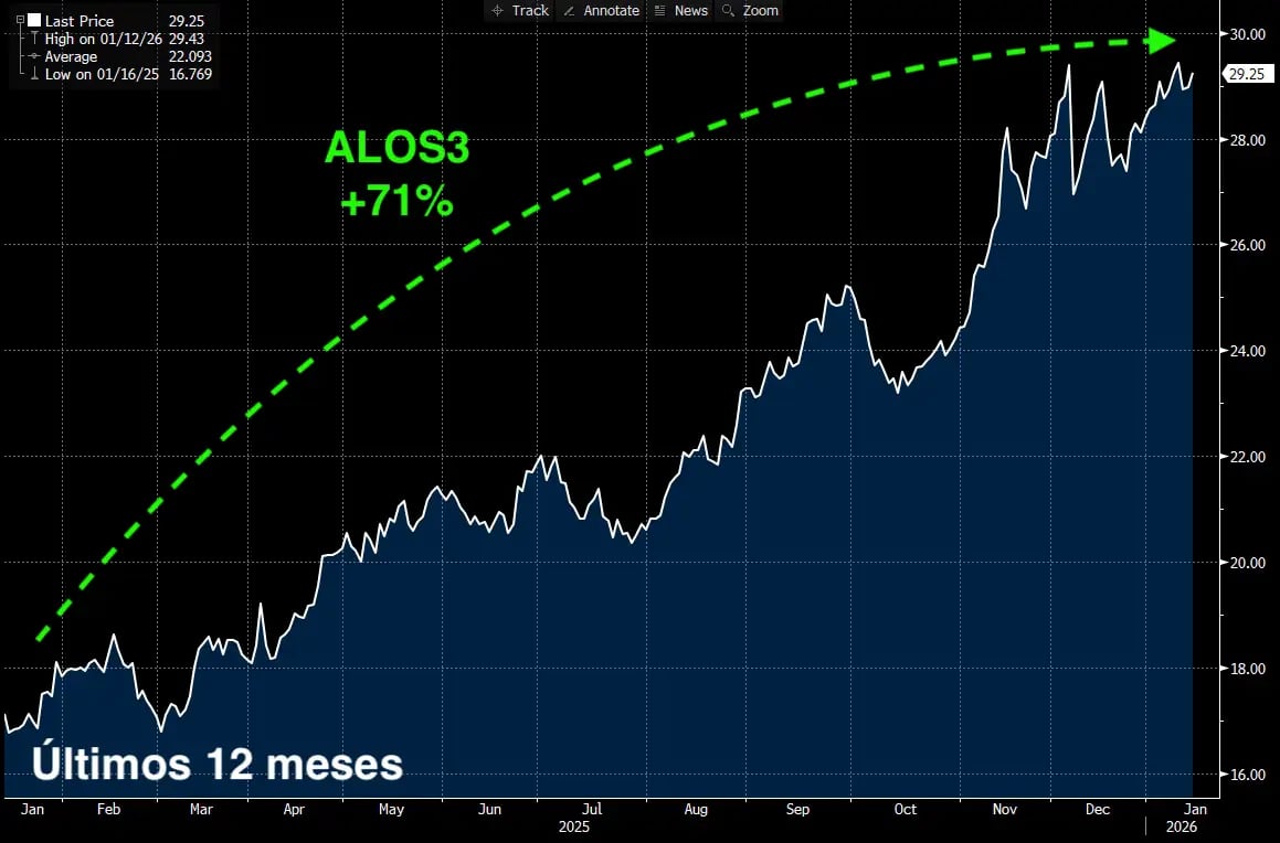 Mesmo que seus papéis sigam nos mesmos níveis de preço atuais, o retorno esperado com ALOS3 seria, basicamente, os 12% dos dividendos (abaixo dos 15% atuais da Selic).