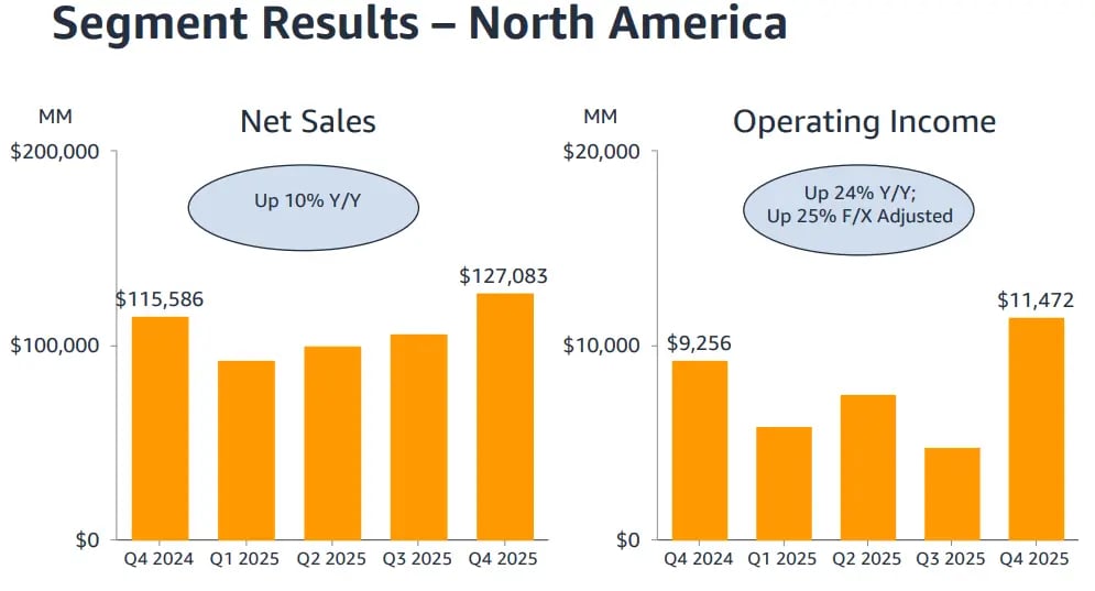 Dentro do negócio de Advertising, a Amazon segue com um vetor relevante de criação de valor. As receitas cresceram +22% no trimestre, adicionando mais de US$ 12 bilhões ao longo de 2025.