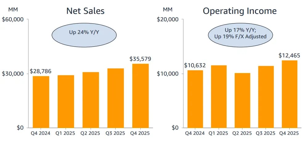 A Amazon Web Services (AWS) foi o grande destaque do trimestre. A receita atingiu US$ 35,6 bilhões, crescimento de +24% a.a., o ritmo mais rápido em mais de três anos, sobre uma base anualizada de aproximadamente US$ 142 bilhões.