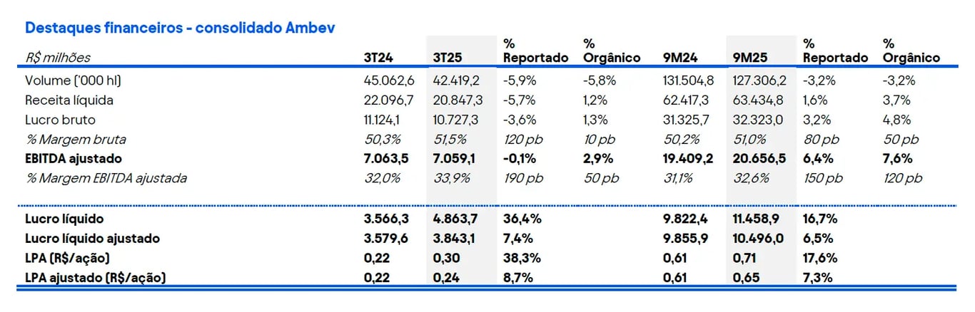 Destaques do resultado da Ambev (ABEV3) no 3T25