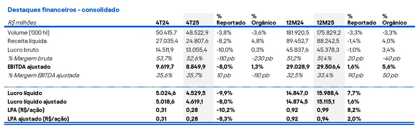 Destaques do resultado da Ambev (ABEV3) no 4T25