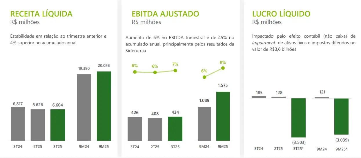A Usiminas (USIM5) apresentou seu balanço do terceiro trimestre (3T25), abaixo das expectativas do mercado, com uma receita líquida consolidada de R$ 6,6 bilhões, resultado praticamente estável em relação ao 3T24.