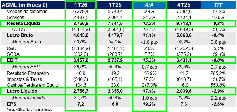 Do ponto de vista operacional, o trimestre continua mostrando o que faz da ASML um ativo tão único dentro da cadeia de semicondutores.