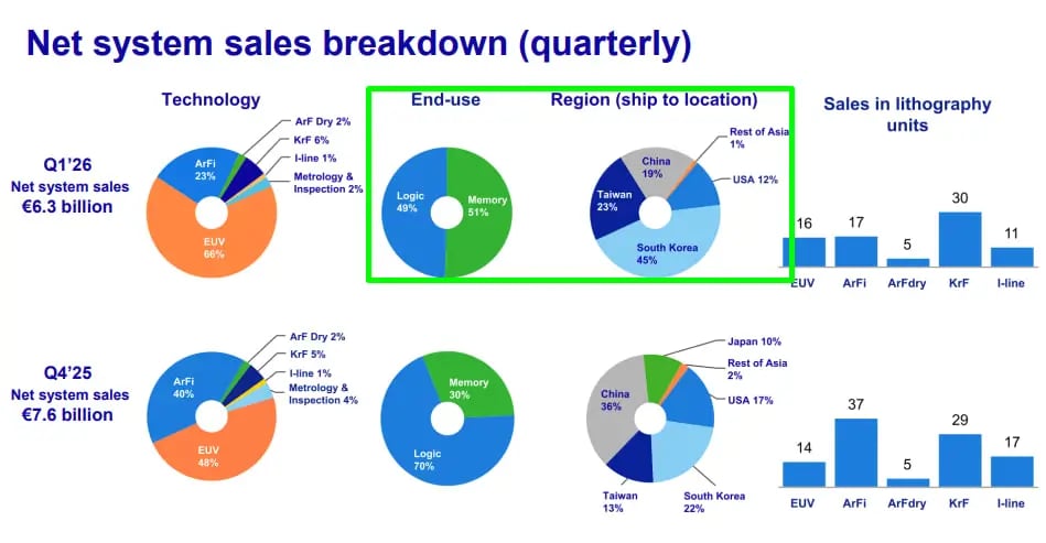 No 1T26, as vendas de novos sistemas cresceram +9,4% na comparação anual. O grande destaque foi o crescimento nas vendas para chips de memória, que passaram a ter participação maior que os chips de lógica.