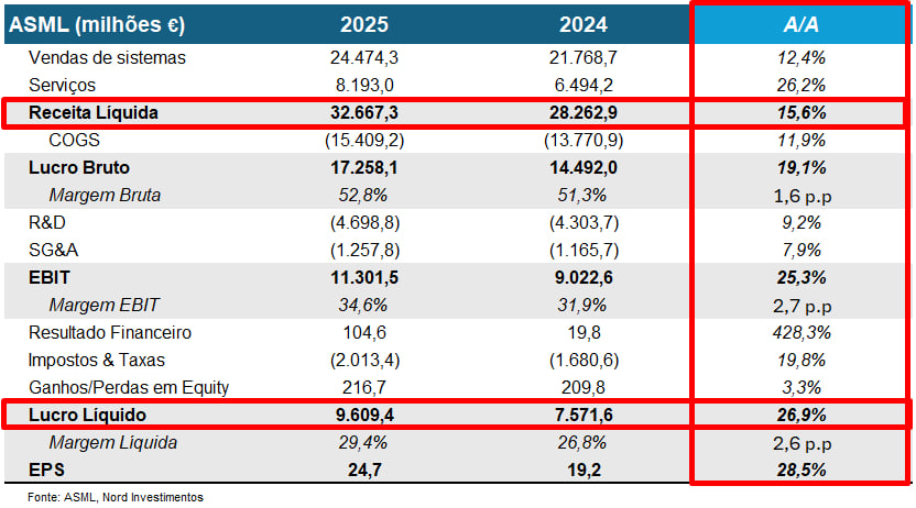 Em 2025, a ASML entregou um crescimento sólido, marcado principalmente pelo ganho de margens com eficiência. As vendas de sistemas cresceram +12,4%, enquanto as receitas com serviços cresceram +26,2%. No agregado, a receita líquida da empresa cresceu +15,6% no ano. A margem bruta superou as expectativas e atingiu 52,8% (expectativa de 52% no começo do ano).