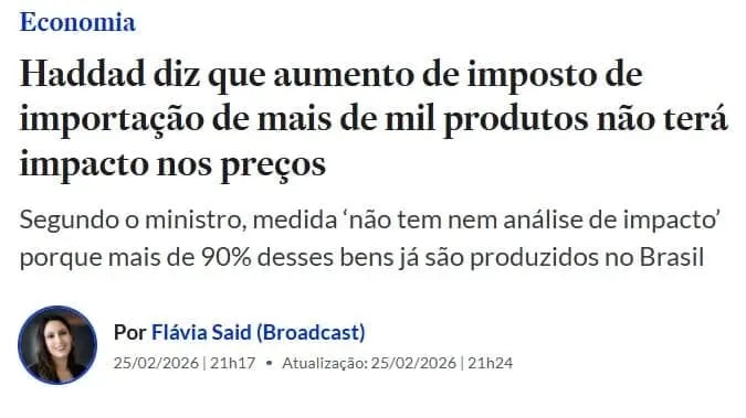 A justificativa oficial para a medida adotada segue o roteiro conhecido: proteger a indústria nacional, melhorar as contas externas e, segundo o ministro da Fazenda, Fernando Haddad, “não haverá impacto relevante sobre os preços”.