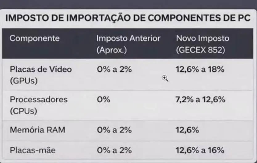 O Brasil não é produtor relevante de semicondutores avançados, GPUs ou CPUs, nem domina a cadeia global de chips. Ainda assim, alíquotas que eram próximas de zero passaram para dois dígitos, como mostra o caso de placas de vídeo, processadores e memórias no quadro abaixo.