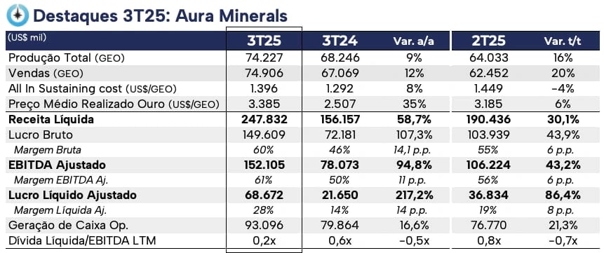 A Aura Minerals (AURA33) reportou resultados acima das nossas expectativas no terceiro trimestre de 2025 (3T25), com uma receita líquida de US$ 247,8 milhões, um crescimento de +58,7. O Ebitda ajustado foi de US$ 152 milhões, alta de +94,8%, enquanto o lucro líquido ajustado foi de US$ 68,7 milhões, aumento de +217%, com todos os resultados comparados ao mesmo período de 2024.
