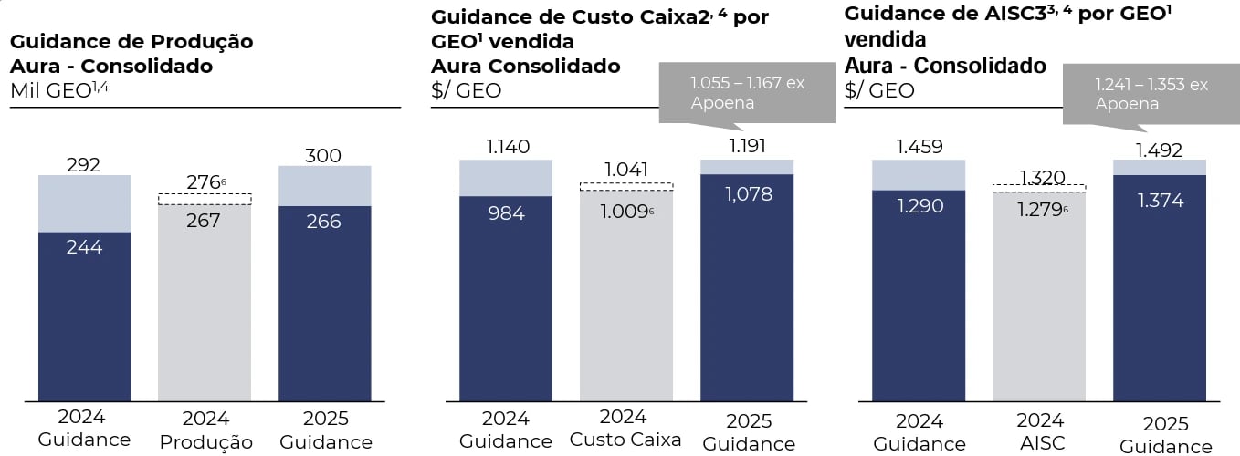 No 3T25, a mineradora totalizou uma produção de 74,2 mil GEO (onças equivalentes de ouro), aumento de +9% na comparação com o 3T24.