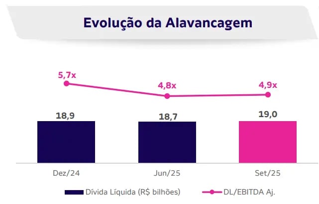 Por fim, devido em grande parte à aquisição da AES Brasil, a dívida líquida alcançou R$ 19 bilhões, fazendo com que a sua alavancagem financeira (dívida líquida/Ebitda) permanecesse elevada em 4,9x (vs. 5,7x no 4T24).