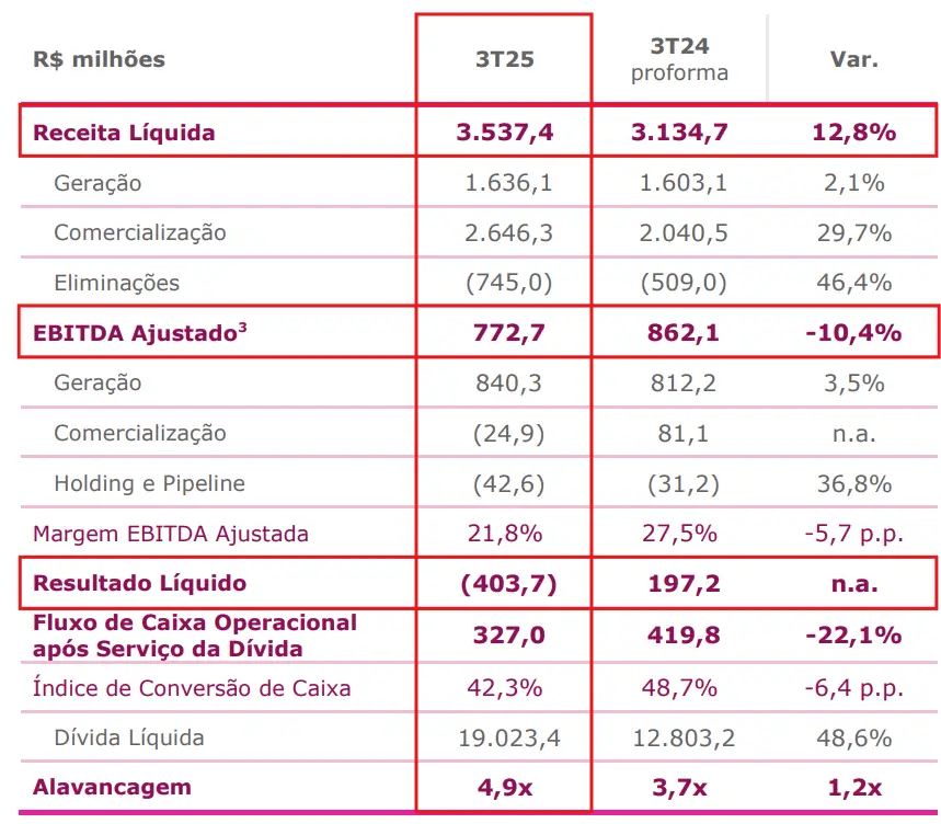 Já o Ebitda ajustado da geradora de energia ficou em R$ 772,7 milhões, baixa de -10%, enquanto o prejuízo foi de R$ -403,7 milhões, ante um lucro líquido de R$ 197,2 milhões no 3T24.