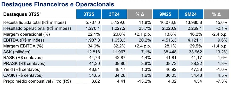 Entre os principais destaques positivos do trimestre estão o recorde histórico de receita e Ebitda, além da expansão da margem Ebitda em 2,4 pontos percentuais. A capacidade medida em ASK cresceu 7,1%, com uma taxa de ocupação recorde de 84,6%.