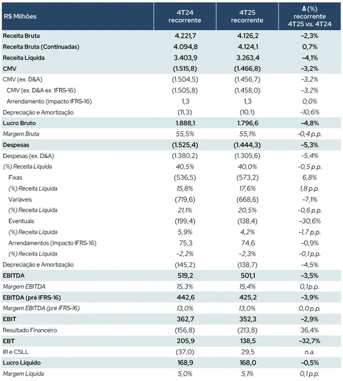 O Azzas 2154 registrou uma receita bruta de R$ 4,13 bilhões no 4T25, o que representa uma queda de -2% em relação ao mesmo período do ano anterior. Porém, considerando as marcas continuadas (Dzarm, Reserva Simples, Reversa, Raw, Alme e TROC deixaram de fazer parte do portfólio), a receita bruta foi de R$ 4,12 bi, leve alta de +1%.