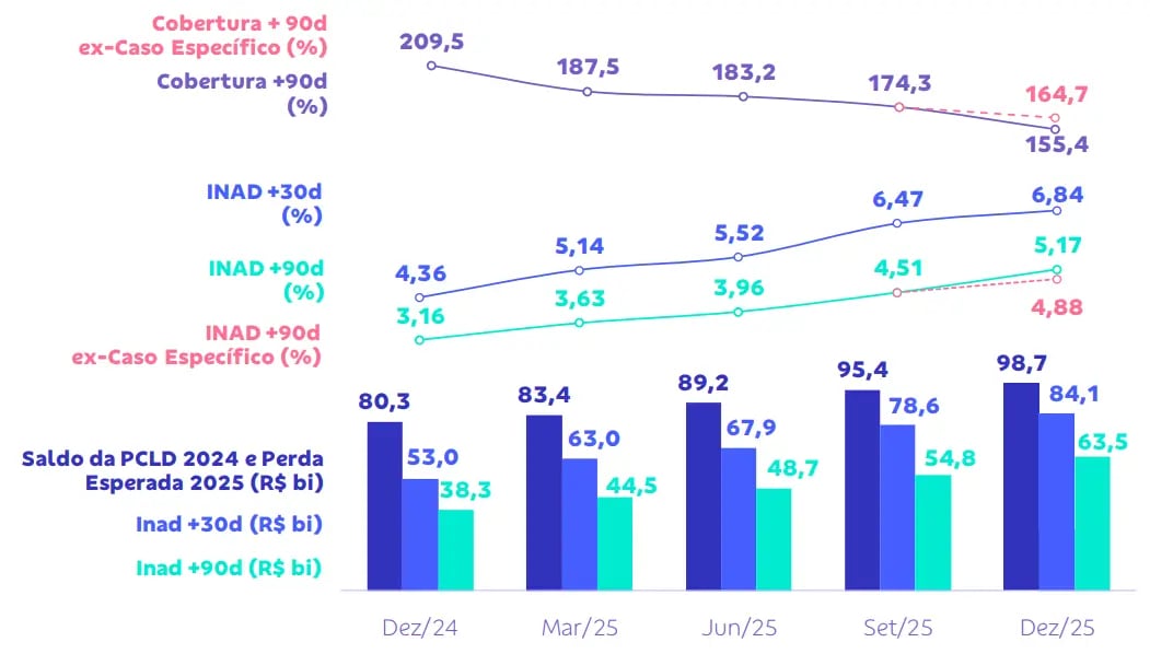 Por fim, com a queda de seu lucro, o ROE (ou “RSPL” = Retorno Sobre Patrimônio Líquido) caiu para 12,4%, ante 20,8% no mesmo período do ano passado. No consolidado de 2025, o ROE foi de 11,4% (-10 p.p. versus 2024).