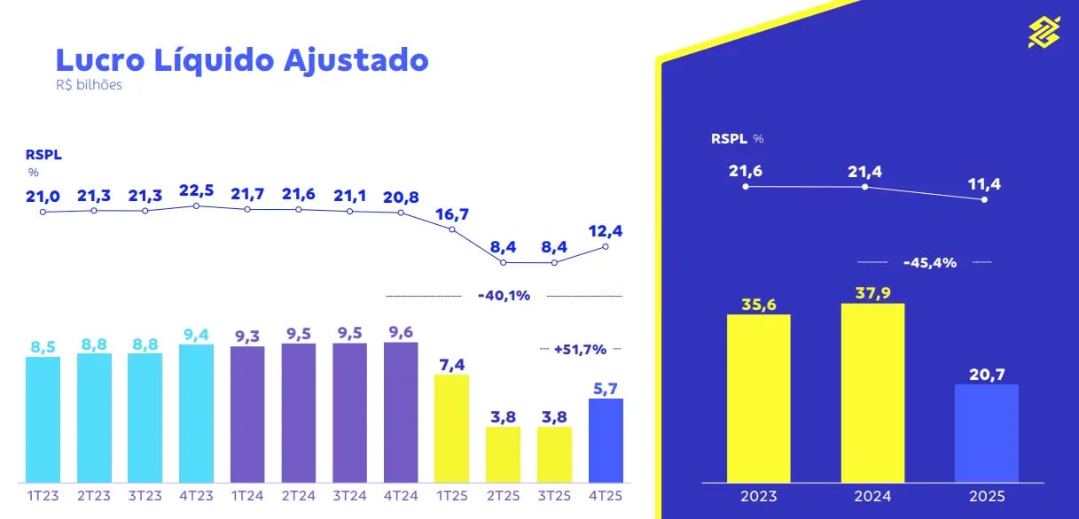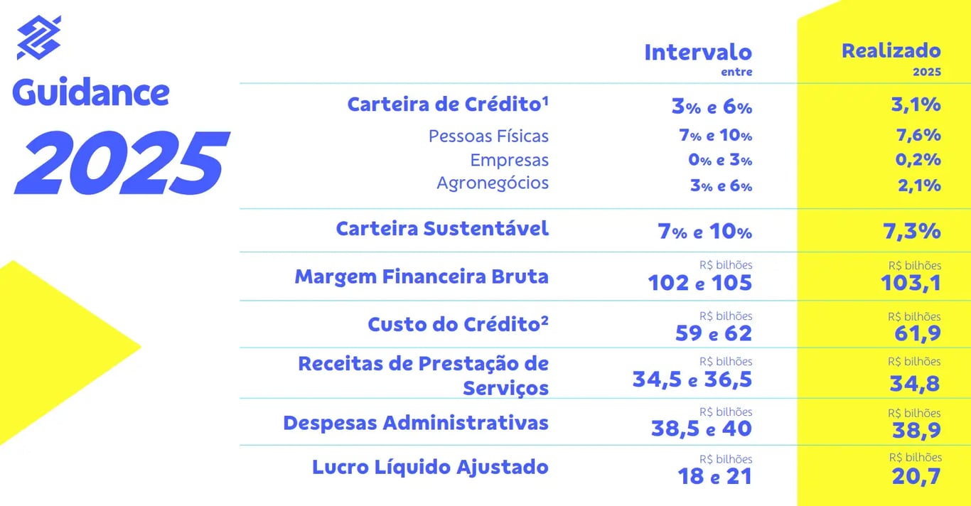 Após diversas revisões negativas, o BB cumpriu todas as linhas de seu guidance (projeções) para 2025. Por exemplo, o lucro líquido do ano foi de R$ 20,7 bi, ficando dentro do intervalo esperado de R$ 18 bi a R$ 21 bi, mas muito abaixo das projeções originais, de R$ 37 bi a R$ 41 bi.