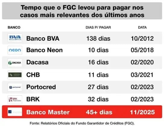 No caso do Banco Master, milhões de reais seguem congelados à espera do FGC — e o dado objetivo chama atenção: esse já é o pagamento mais lento do Fundo em mais de uma década, superando praticamente todos os casos recentes.