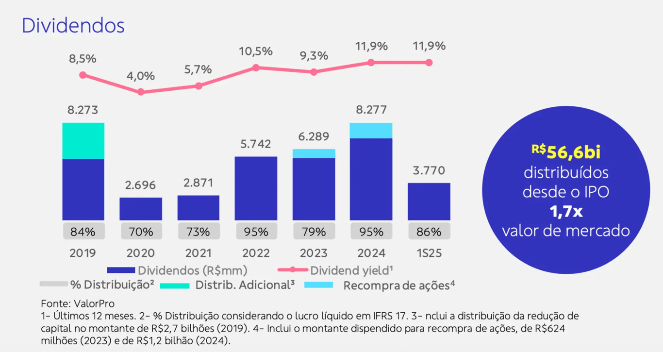 Apesar desse cenário de transição, a BB Seguridade segue atrativa para quem busca dividendos. A projeção para 2026 é de um dividend yield de aproximadamente 11% (em linha com o rendimento recente), com um preço teto de R$40.