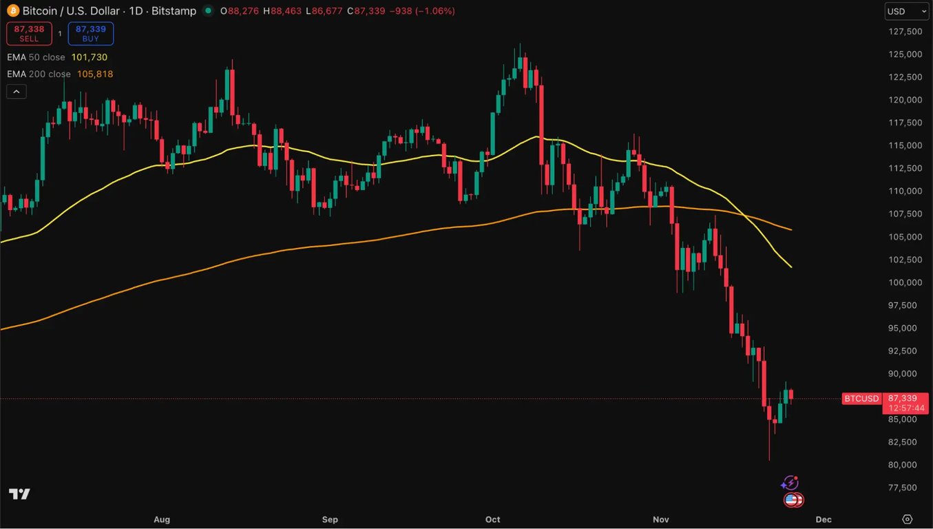 O bitcoin (BTC) está negociando entre US$ 86 mil e US$ 87 mil, queda superior a -30% desde o recorde recente de US$ 126 mil, registrado no dia 6 de outubro. Isso apagou todos os ganhos do ano. Apenas nesta semana, o ativo caiu mais de -4%, acumulando perdas superiores a -20% no mês e mais de -8% nos últimos 12 meses.