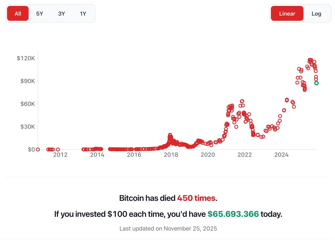 Mais uma vez, nosso querido bitcoin morreu. Essa queda recente marcou a 450ª vez que ele foi declarado “morto” por algum veículo de notícia.