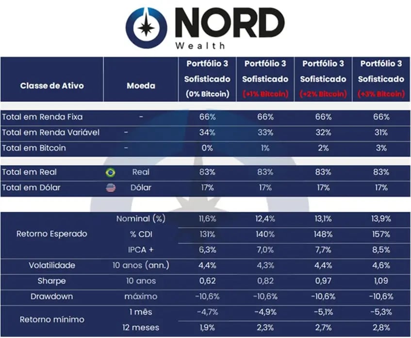 O estudo compara um portfólio base da Nord com versões idênticas desse mesmo portfólio, adicionando 1%, 2% e 3% de exposição ao bitcoin. Todo o resto permanece igual, justamente para isolar o efeito do ativo.