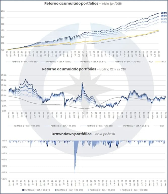 É com esse pano de fundo que, na Nord Wealth, conduzimos um estudo interno comparando quatro carteiras: uma sem bitcoin e outras três com exposições graduais de 1%, 2% e 3%.