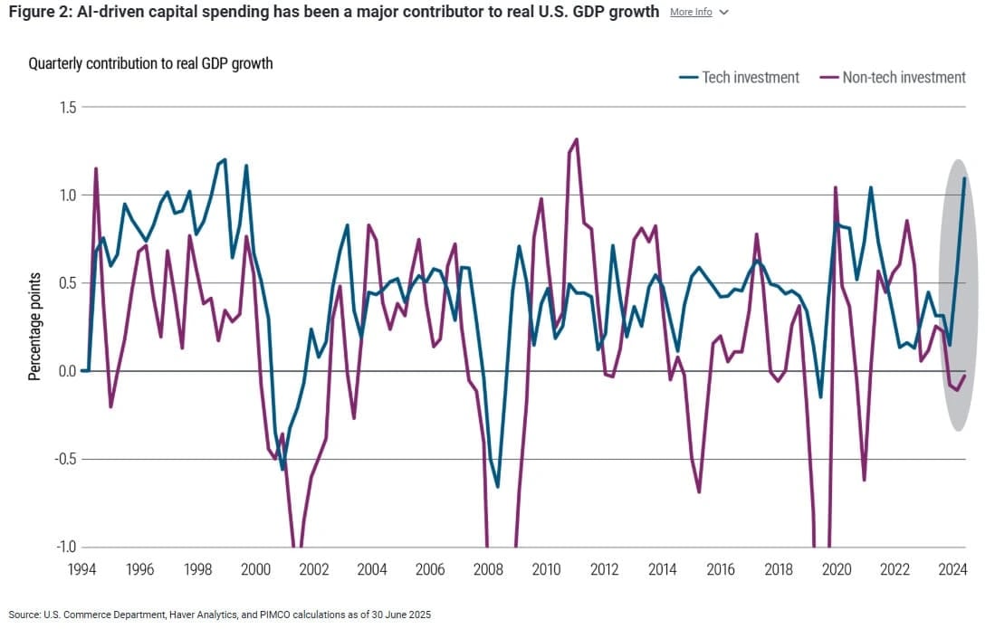 Os gastos relacionados à inteligência artificial nos EUA aceleraram em 2025, em contraste com a queda dos investimentos em setores fora desse segmento.