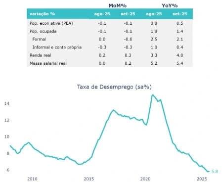 No cenário doméstico, o mercado de trabalho brasileiro segue aquecido. A taxa de desemprego se manteve em 5,6% em setembro. Com o ajuste sazonal, o desemprego se manteve em 5,8%, nos menores patamares da série histórica.