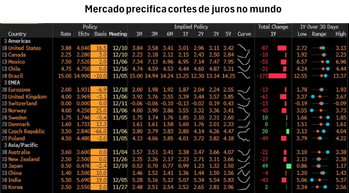 O gráfico abaixo também nos mostra que o mercado precifica cortes de juros na maioria dos países, com o Brasil como destaque, com corte precificado de 1,75 p.p. (em 12 meses).