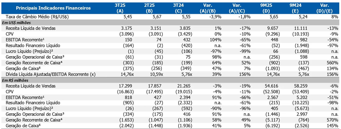 No 3T25, a Braskem registrou resultados em linha com as expectativas do mercado, com uma receita líquida de R$ 17,3 bilhões, queda de -19% em comparação ao mesmo trimestre do ano anterior. O Ebitda recorrente somou R$ 818 milhões, recuo de -66%, enquanto o período foi encerrado com prejuízo líquido de R$ 26 milhões.