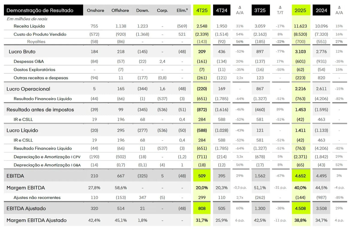 O resultado financeiro (negativo) foi -64% menor (redução da dívida e impactos cambiais sem efeito caixa no 4T24), mas a depreciação foi 3,3x maior (incorporação da Enauta na holding), e a companhia reportou prejuízo de R$ -588 milhões no trimestre (vs. R$ -1 bilhão no 4T24).