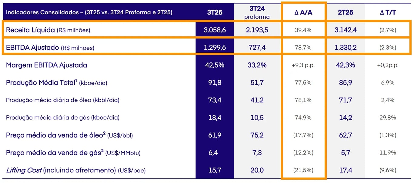 Ainda que o 4T25 possa ser mais fraco do que o 3T25, devido (i) aos ajustes no FPSO de Atlanta, (ii) às paradas programadas de 12 dias em Papa-Terra e 21 dias no Parque das Conchas e (iii) à interdição temporária imposta pela ANP na Bacia Potiguar, ainda, assim, haverá um forte crescimento na comparação anual (4T24 teve produção de 39 mil barris/dia).