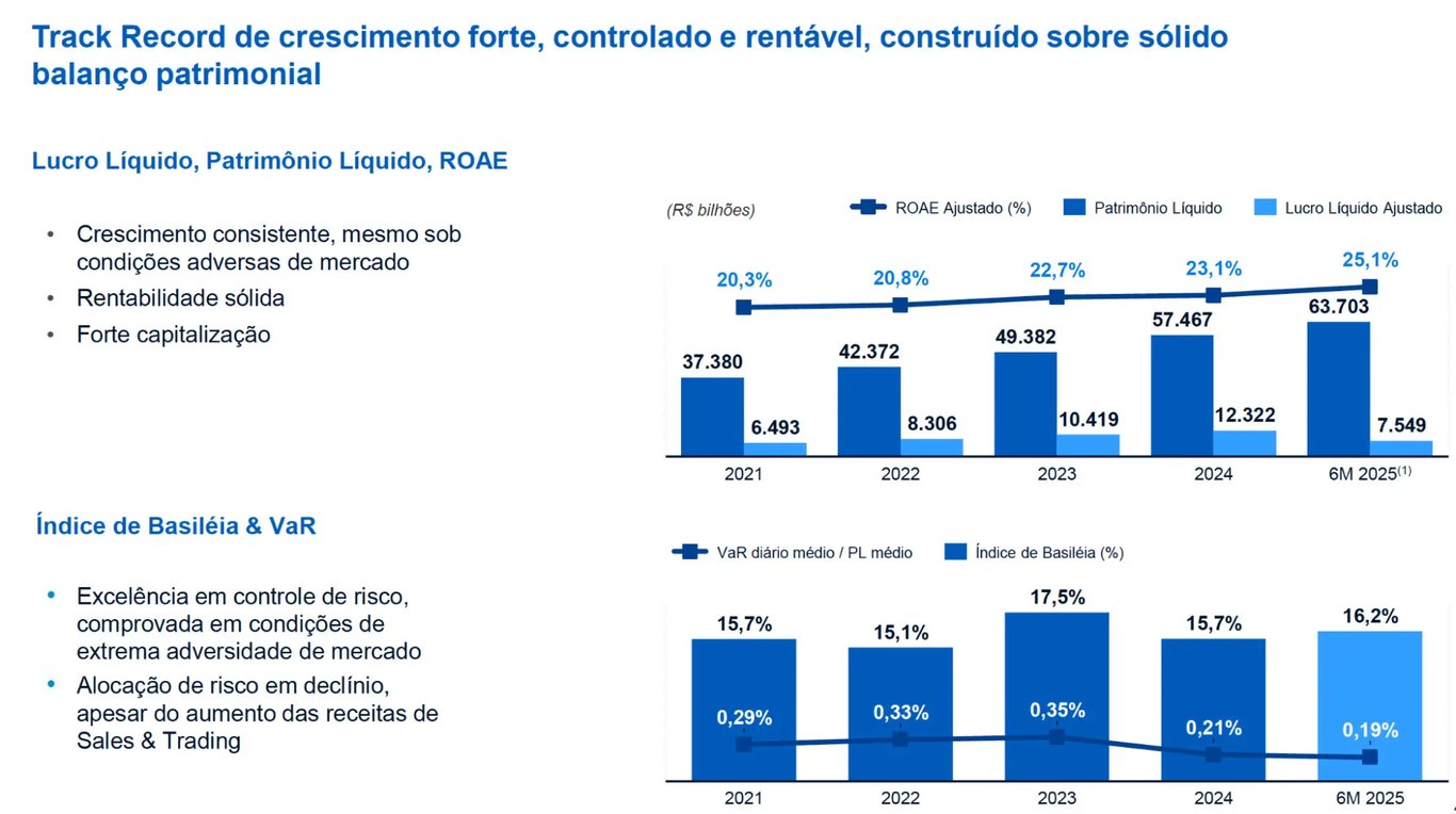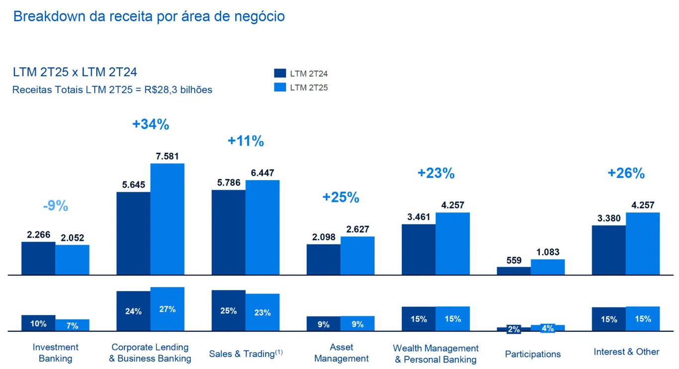 Em Sales & Trading (mesa de operações), o banco retomou o crescimento em 2025, em função da maior quantidade de produtos e da atividade de clientes, mesmo com alocação de risco em operações proprietárias seguindo em declínio.