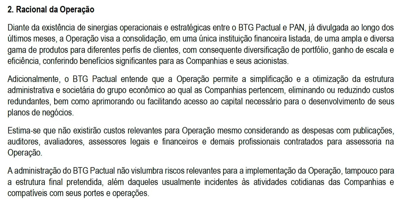 O BTG informou que não haverá custos relevantes relacionados à realização da operação e que não vislumbra riscos significativos para a implementação da mesma (sujeita à aprovação do Bacen, sem grandes riscos de negativa).