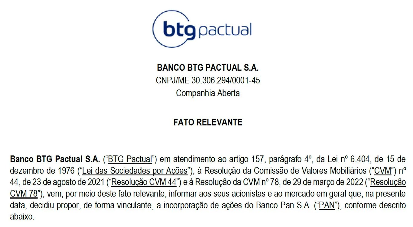 Depois de um longo período de elevada expectativa do mercado sobre este anúncio, o BTG Pactual (BPAC11) finalmente está propondo a incorporação das ações do Banco Pan (BPAN4), oferecendo suas ações em troca das do Pan, para tornar o banco uma de suas subsidiárias integrais.