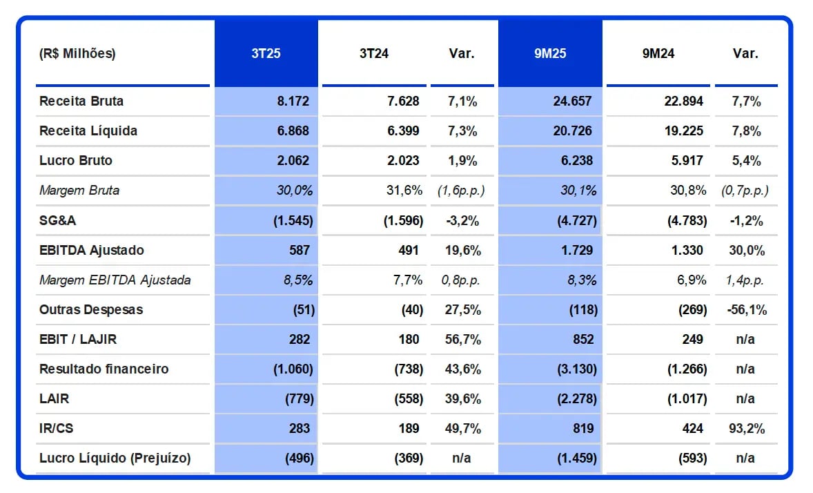 Despesas financeiras superam R$ 1 bilhão no 3T25 e prejuízo avança para R$ R$ 533 milhões; veja noassa análise