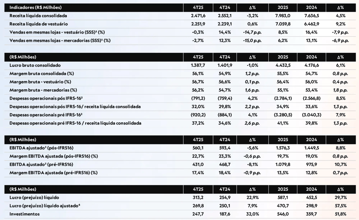 No 4T25, a C&A (CEAB3) reportou resultados levemente abaixo do esperado pelo mercado. A companhia registrou receita de R$ 2,5 bilhões, queda de -3% na comparação anual. O EBITDA ajustado somou R$ 560 milhões (-8%), enquanto o lucro líquido ajustado atingiu R$ 269,8 milhões, avanço de +8% ano contra ano.