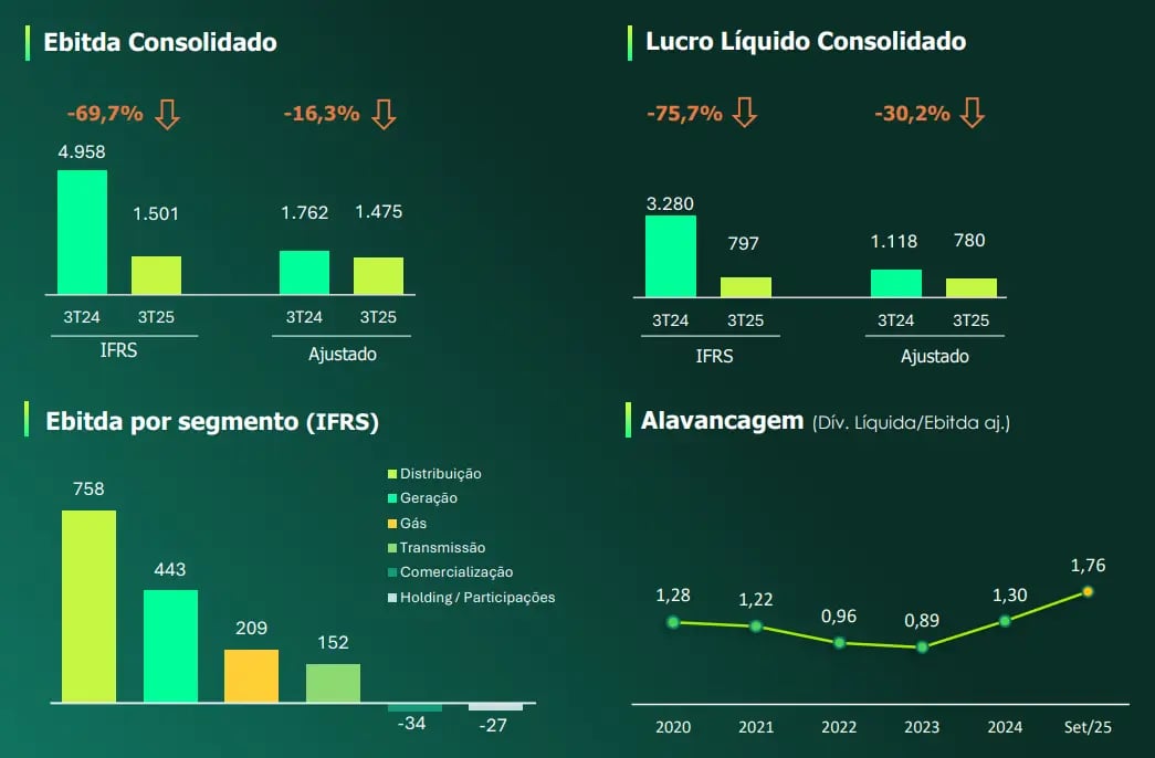 Com seus principais custos e despesas subindo +9%, em grande parte pela energia elétrica comprada para revenda, custo de construção e serviços de terceiros, o Ebitda ajustado atingiu R$ 1,5 bilhão, queda de -16%.
